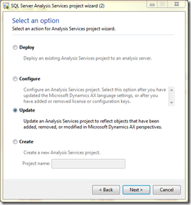 By the selections we made in the wizard. The “Visual Studio Projects” > “Analysis Services Project” > “Dynamics AX” in the AOT is modified to include the changes.